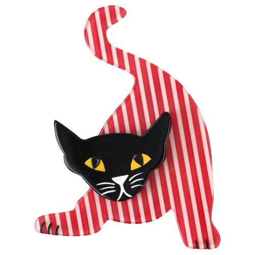 Red and White Striped Head and Black Roudoudou Cat Brooch with Black Eyes