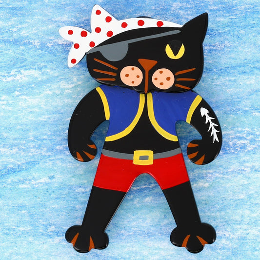 Black, cobalt and red Bandit Cat Brooch