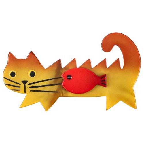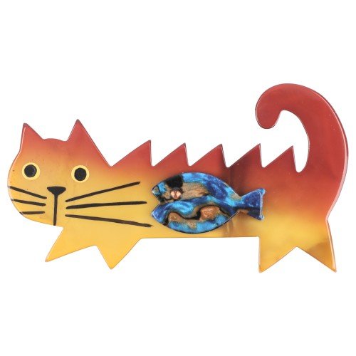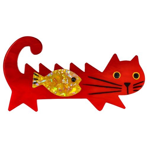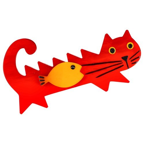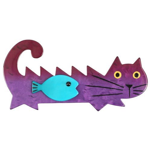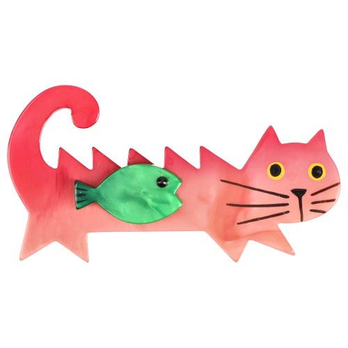 Bordeaux and Pink Standing Cat Brooch with Pink Fish