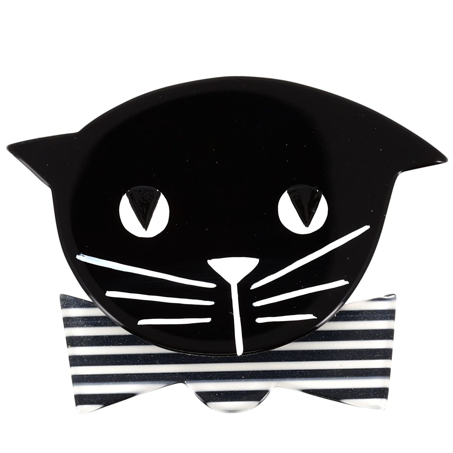 Black Bow Tie Cat Brooch with Horizontal Black and White Striped Bow