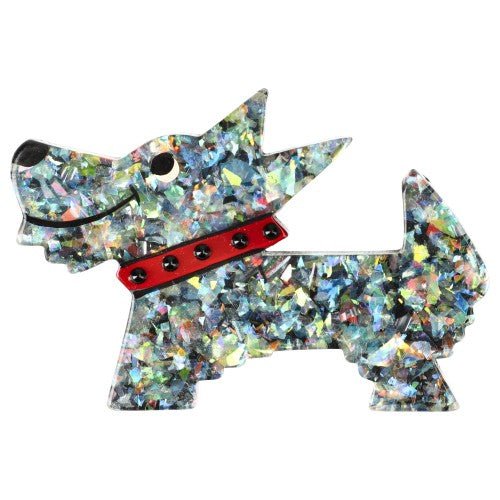 This brooch features a stylized Scottish Terrier in the Art Deco style. Its prominent snout is accentuated, giving it a distinctive and sophisticated look. Around its neck, a finely detailed collar adds an extra touch of elegance. The geometric shapes composing the body of the brooch perfectly reflect the Art Deco style, with clean lines and symmetrical patterns. This unique piece combines the charming silhouette of the Scottish Terrier with the timeless elegance of Art Deco, making it a refined and artistic accessory.
