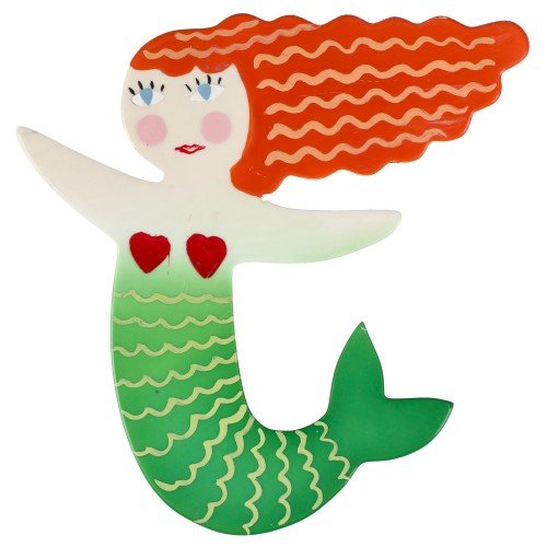 This brooch features a delicate siren, her wavy red hair flowing like the ocean currents. . Perfect for those who cherish the magic of the sea and the tales of its beguiling inhabitants.