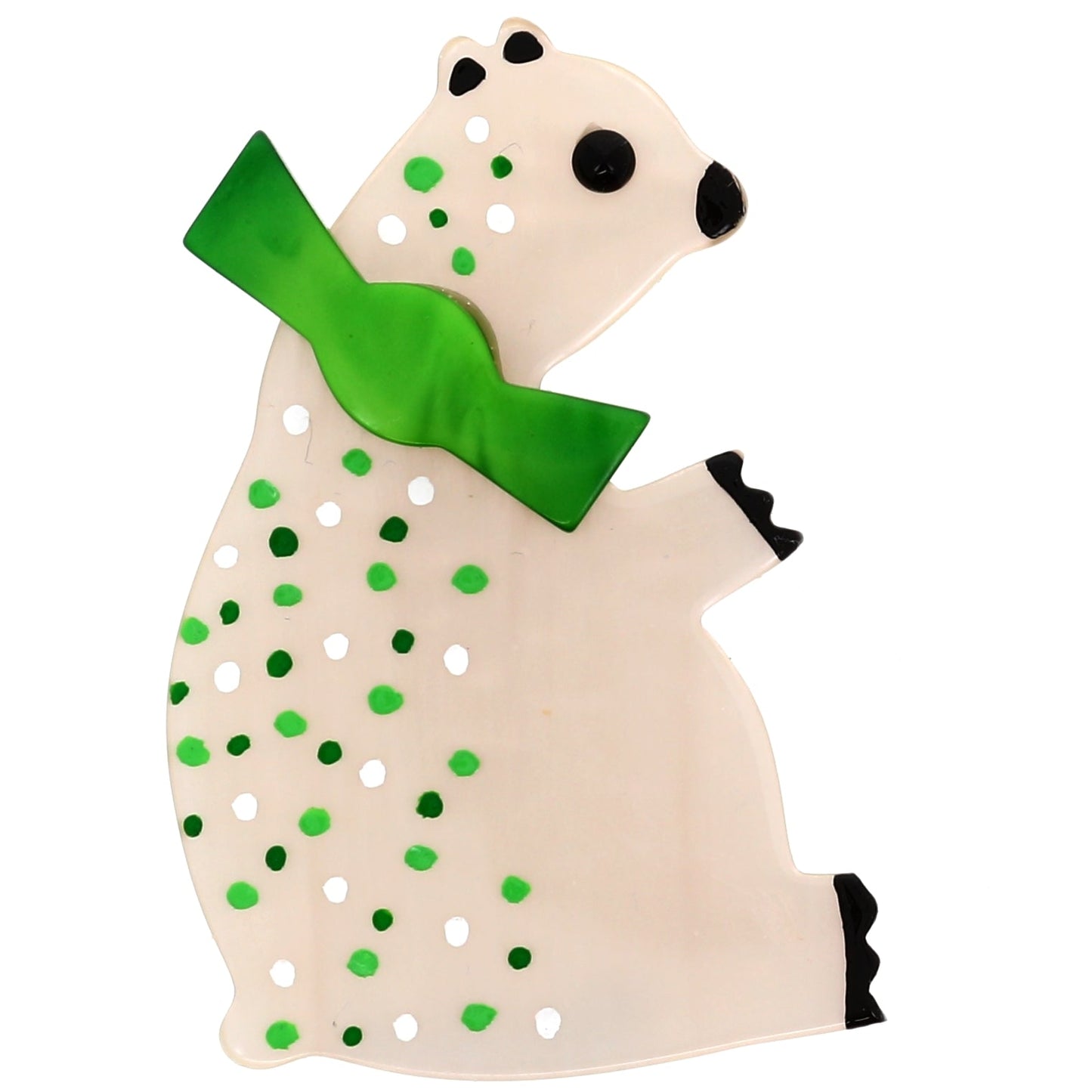 Pearly White Sitting Alex Bear Brooch with a green bow tie and green polka dots